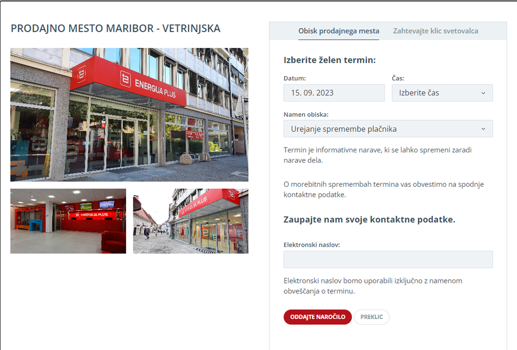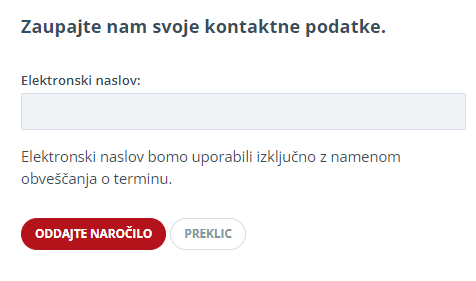 5. Vnesite kontaktni elektronski naslov: Za rezervacijo obiska prodajnega mesta vpišite svoj elektronski naslov, kamor boste prejeli potrditev termina.